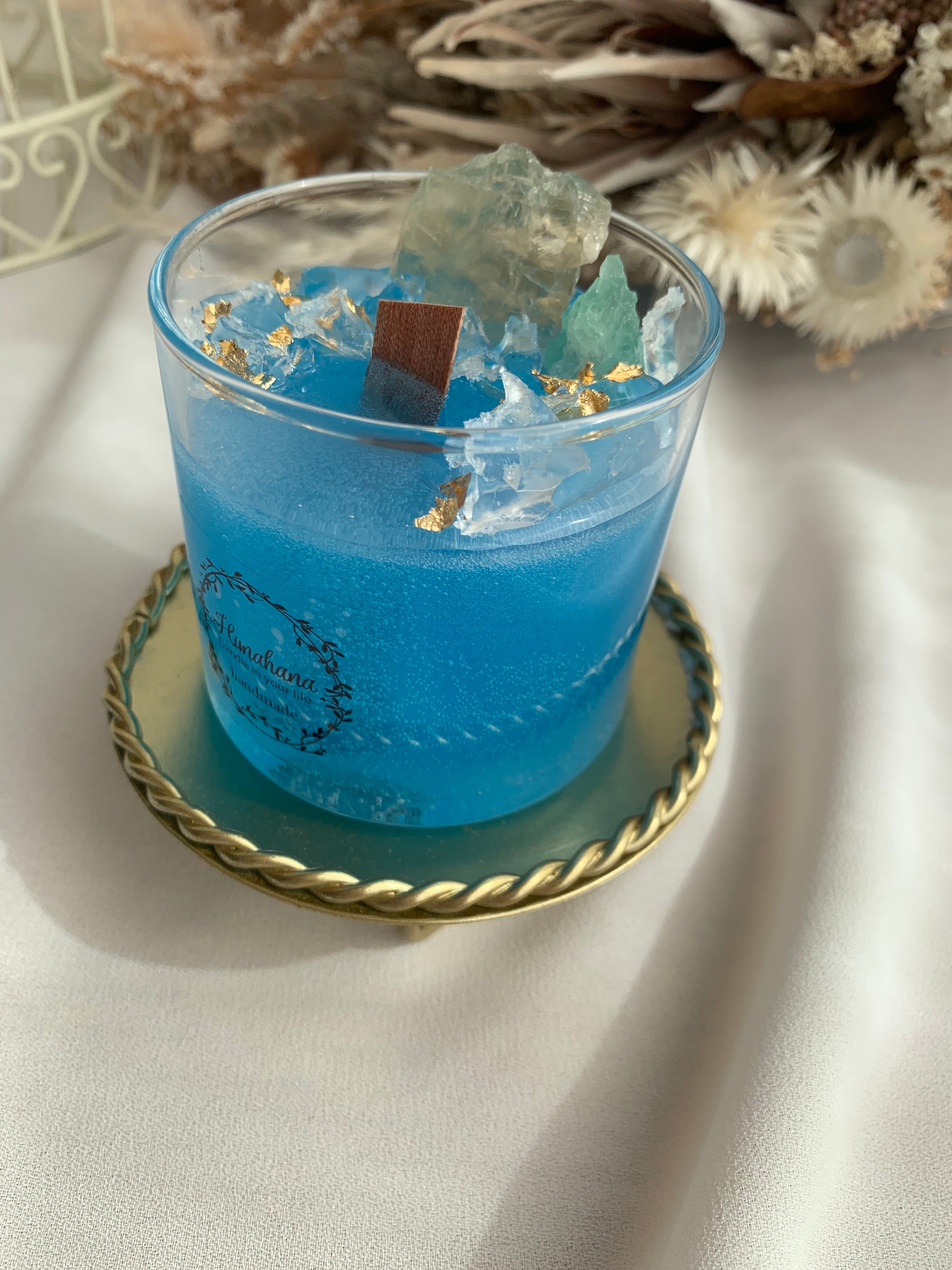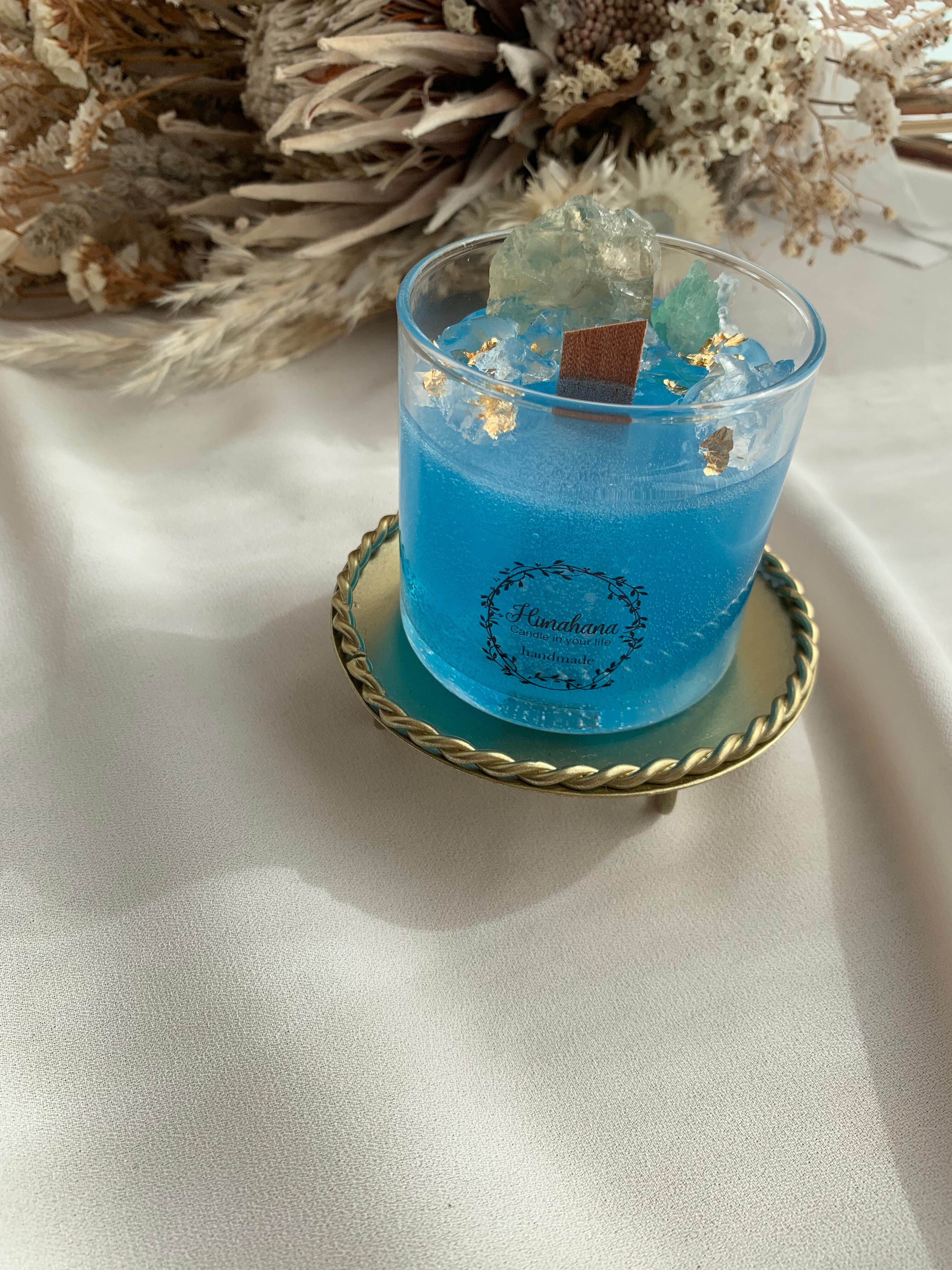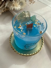 深い海のような色のキャンドルに、天然石をたっぷり詰め込みました♡